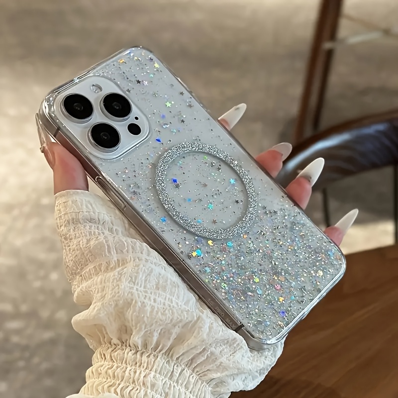 Fashionable Glittering Sequined Magnetic Epoxy Transparent Phone Case Compatible with iPhone 16 15 14 Plus 13 12 11 Pro Max XM XR XS X Blingbling Transparent Shockproof Back Cover.