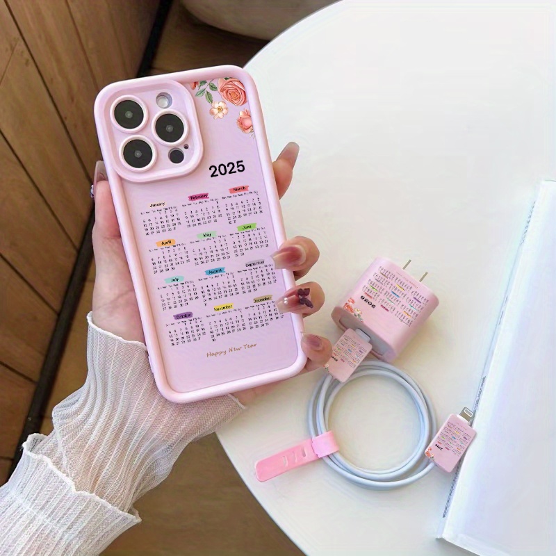 5pcs 2025 Calendar Fashion Pink Gift Phone Case, Exquisite and Fashionable High-end Phone Case + Data Cable Protective Cover, Suitable for iPhone Fast Charging Cable, Suitable for iPhone 11/12/13/13promax/14/2pro/2plus/14promax/15/15pro/16/6-plus/16pro/15promax XSM Precision Phone Case