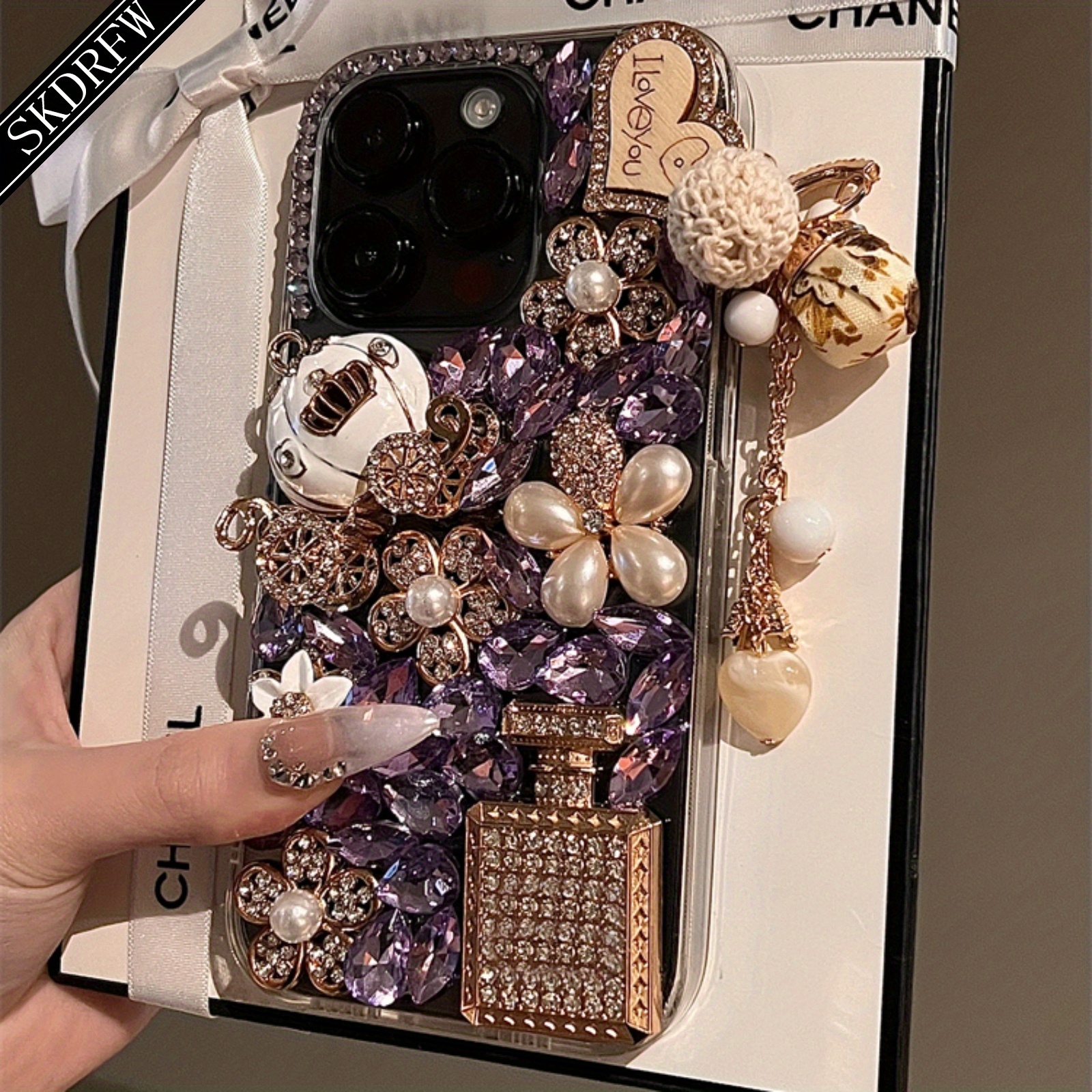 A Luxurious Purple Diamond Perfume Bottle, Pumpkin Carriage, Pearl Flower, And Heart-Shaped Phone Case Suitable for Apple Iphones Including Models 16, 16 Pro, 16 Plus, 16 Pro Max, 15, 15 Pro, 15 Pro Max, 14, 14 Pro, 14 Pro Max, 13, 13 Pro, 13 Pro Max, 12, 12 Pro, 12 Pro Max, And 11. / Handmade with Rhinestones / Unique / Women’S Style / Perfect Gift.