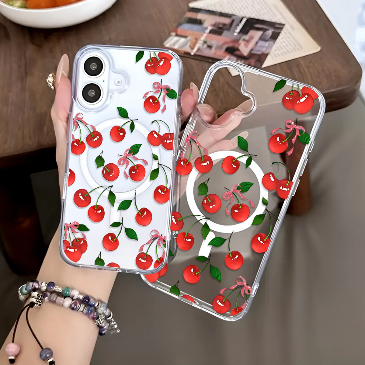 Alluring Cherry Fashion Pattern Design Mobile Phone Case Suitable for iPhone 16 Pro Max Cases 16Pro 16Plus 16Case 15Case 15ProMax 14Pro 14Plus 13Pro 12Pro 11, Shockproof Magnetic Wireless Charging Acrylic Transparent Mobile Phone Case Accessories