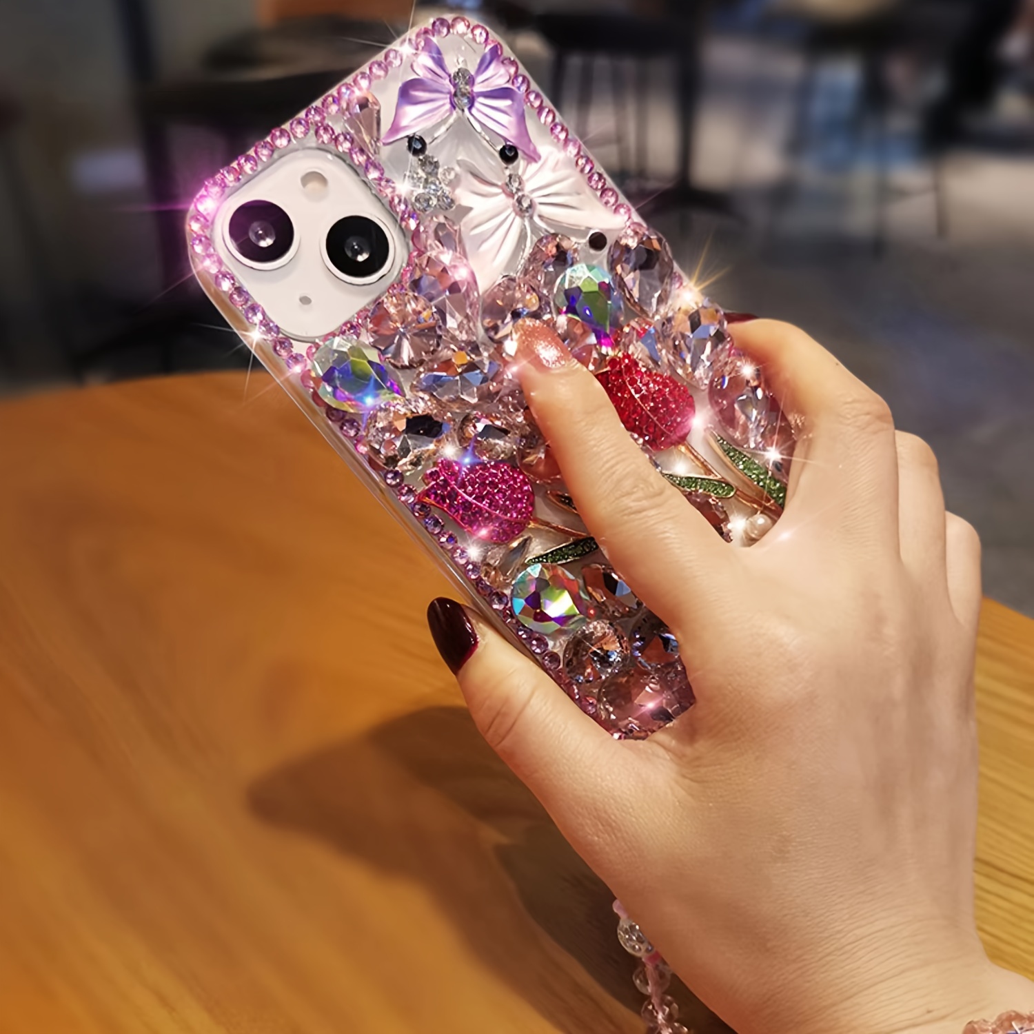 Stylish and Luxurious Double Butterfly Crystal Rose Mobile Phone Protective Case with Crystal Lanyard for iPhone16Promax Anti-Fall Mobile Phone Case