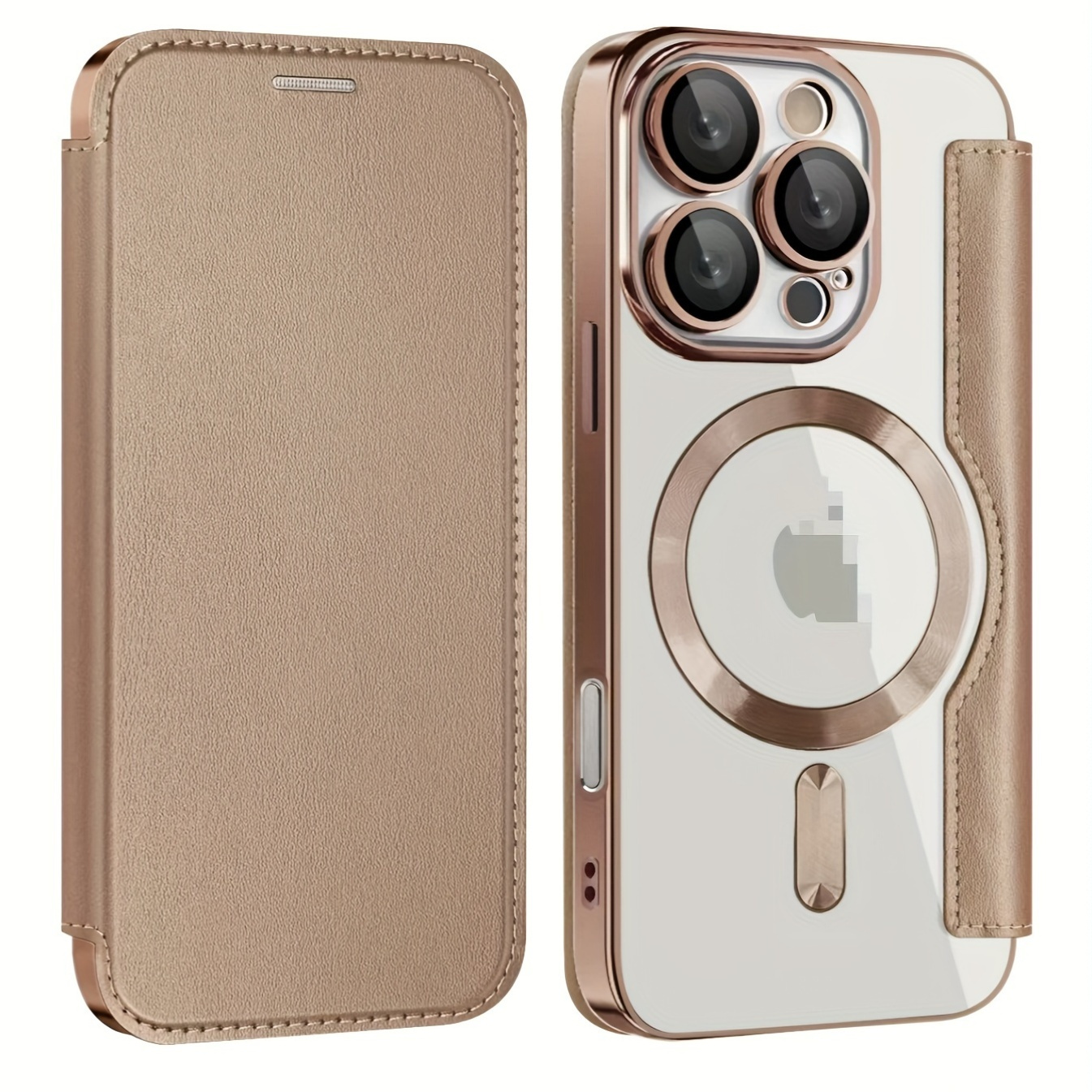 Suitable for Apple 16 Electroplated Gold Plated Shield Magnetic TPU Artificial Leather Mobile Phone Case Iphone 15 Full Cover Flip Lens Film Protective Case 16Pro 15