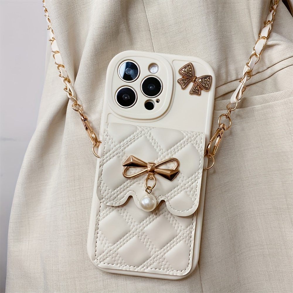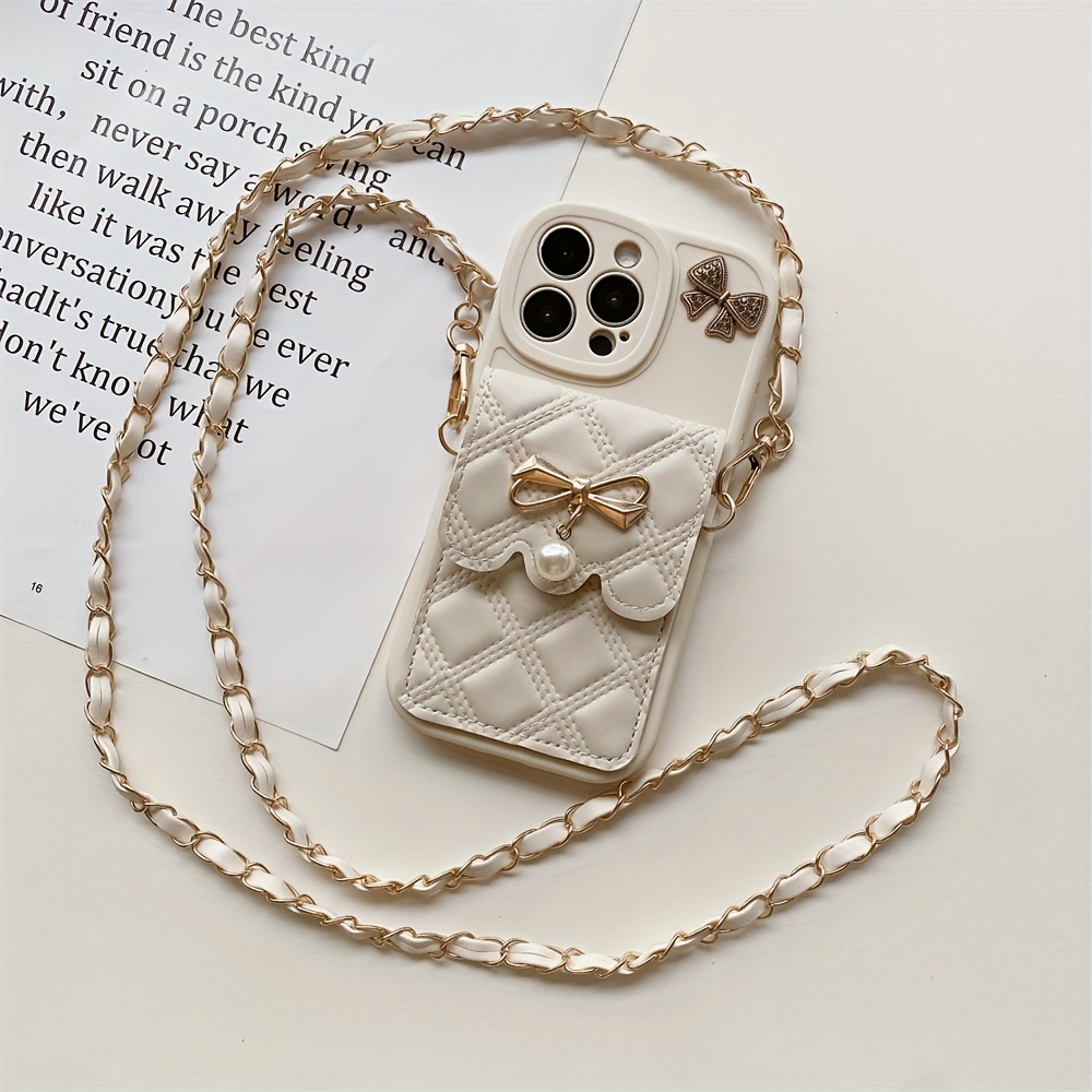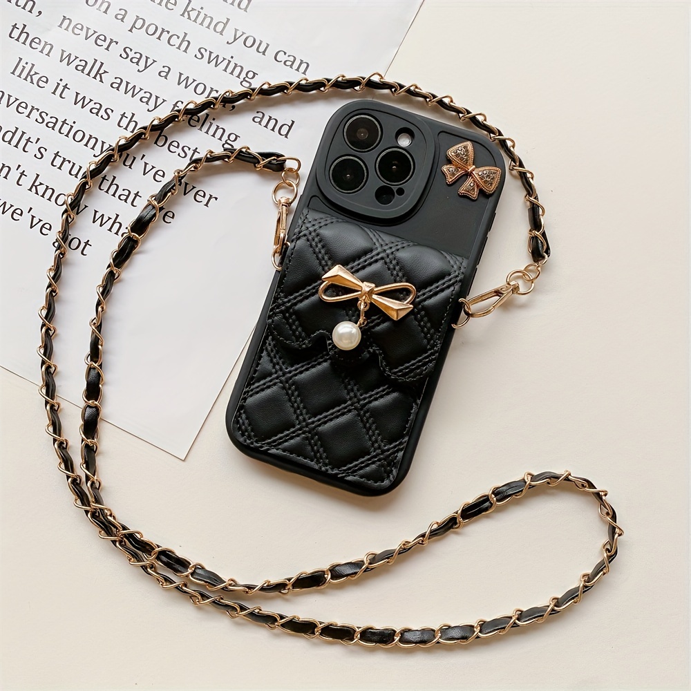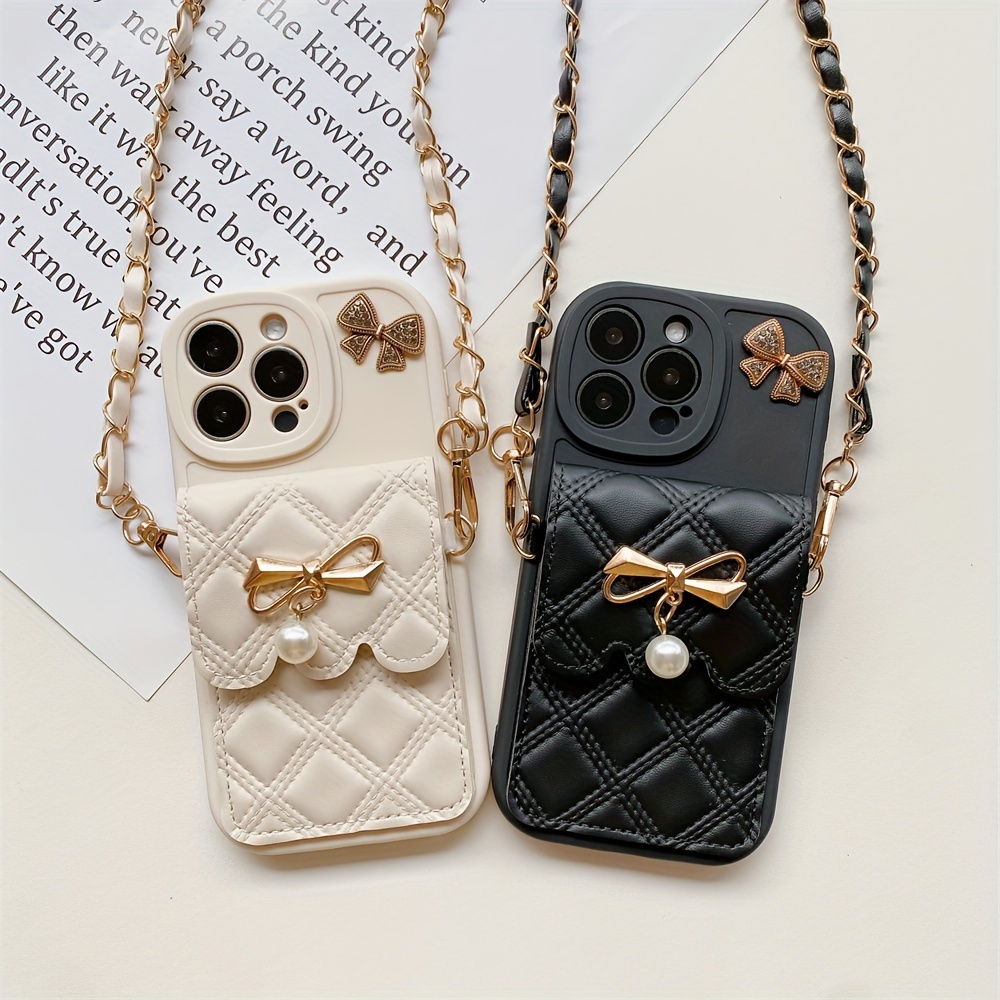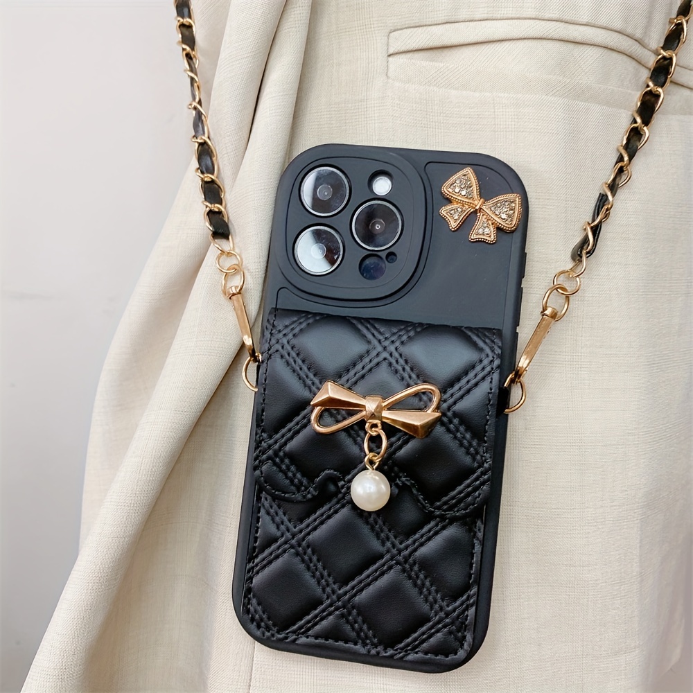 Diamond Grid Bow Card Phone Case Suitable for iPhone 15Promax/14plus with Lanyard Can Be Carried Obliquely 12pro/13promax Full Cover 12Mini/13Mini Soft Case 11 Protective Case Coin Purse