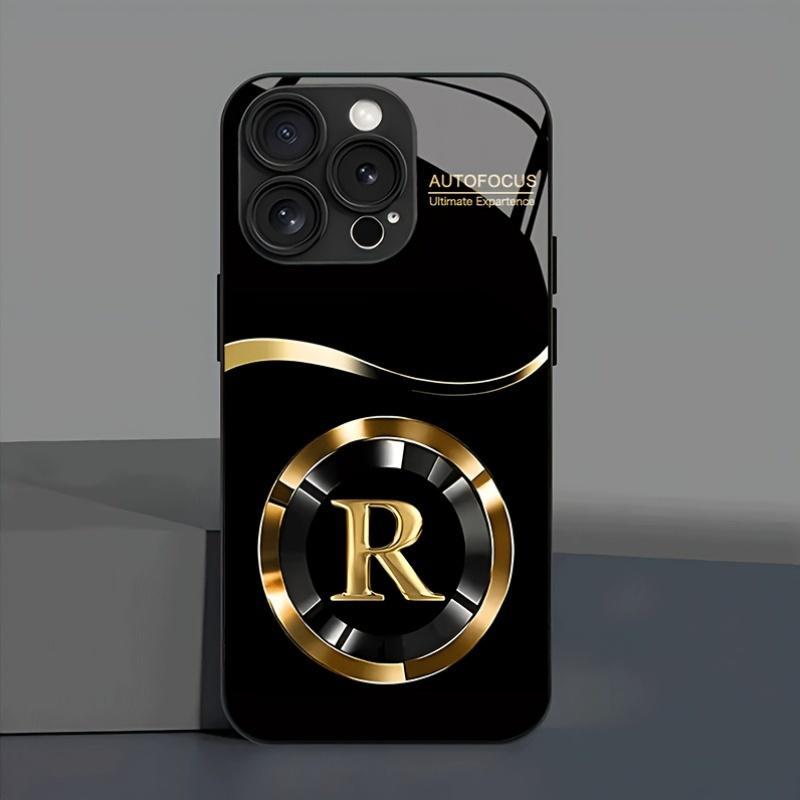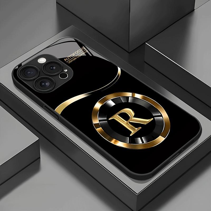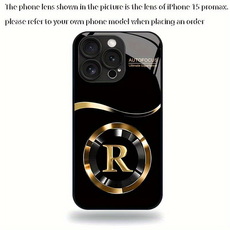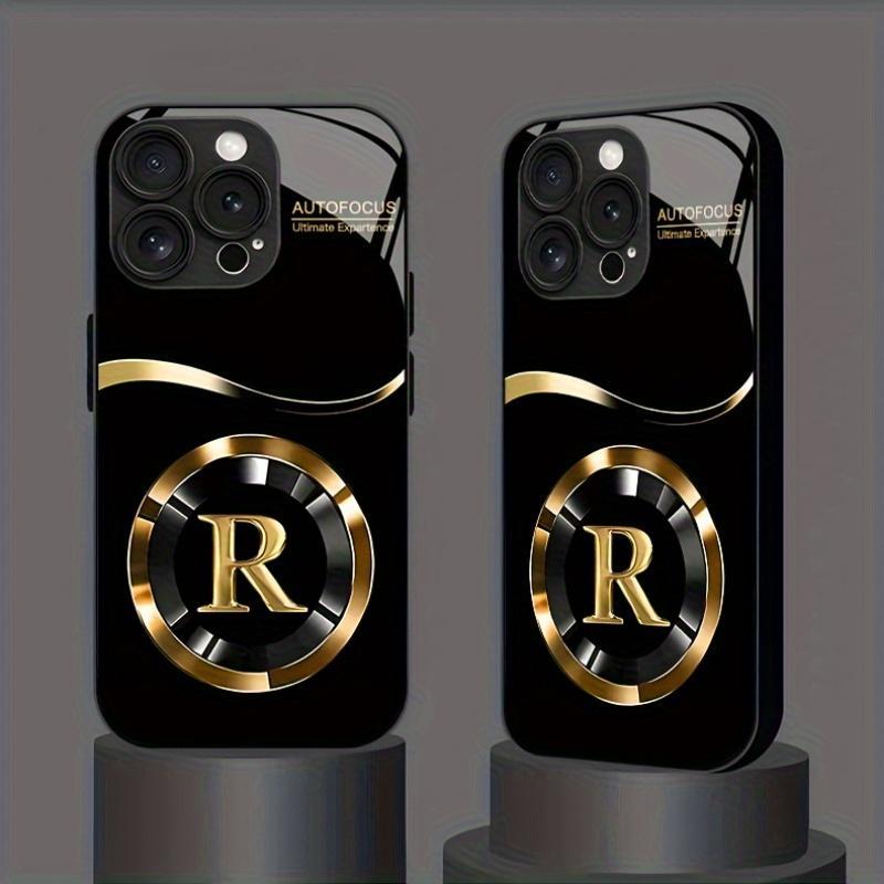 Minimalist Golden Lucky Letter R Pattern Glass Phone Case for iPhone 16/ 16Plus/ 16Pro/ 16ProMax 15/ 15Plus/ 15Pro/ 15ProMax/ 14/ 14Plus/ 14Pro/ 14ProMax/ 13/ 13Pro/ 13ProMax/ 12/ 12Pro/ 12ProMax/ 11/ 11/ 11Pro Max/ x/ xs/ xr/ xs max/ 7/ 8/ 7 Plus/ 8 Plus