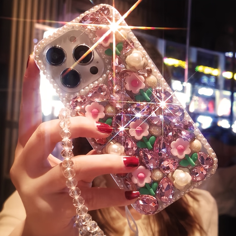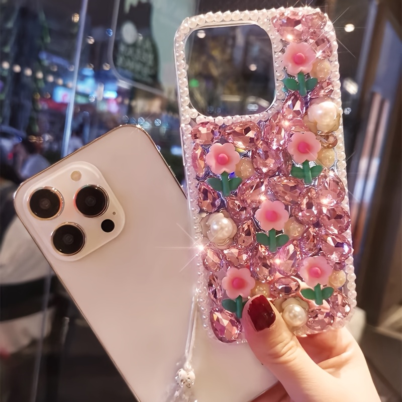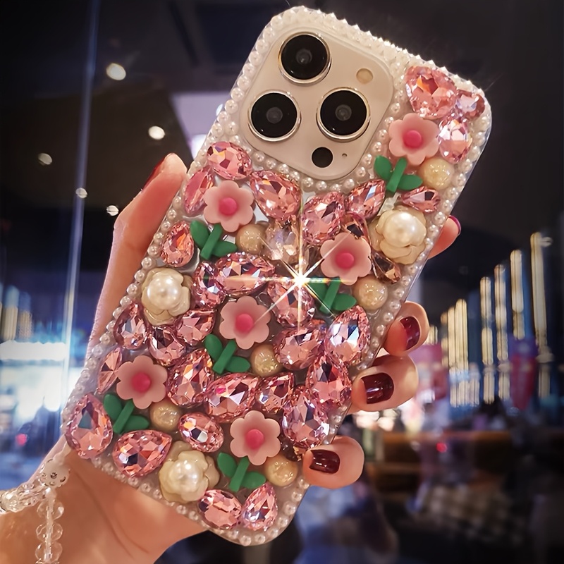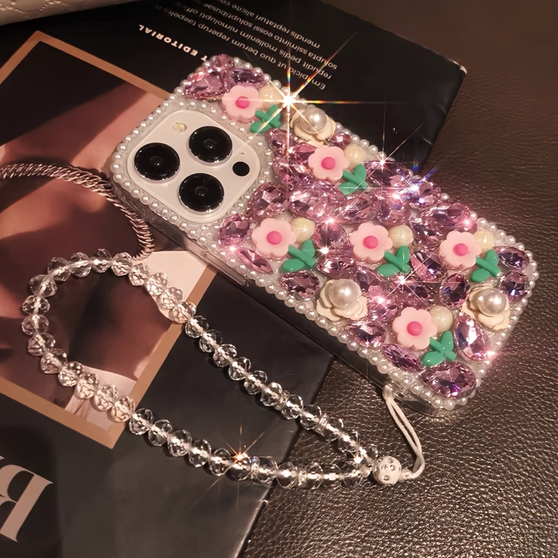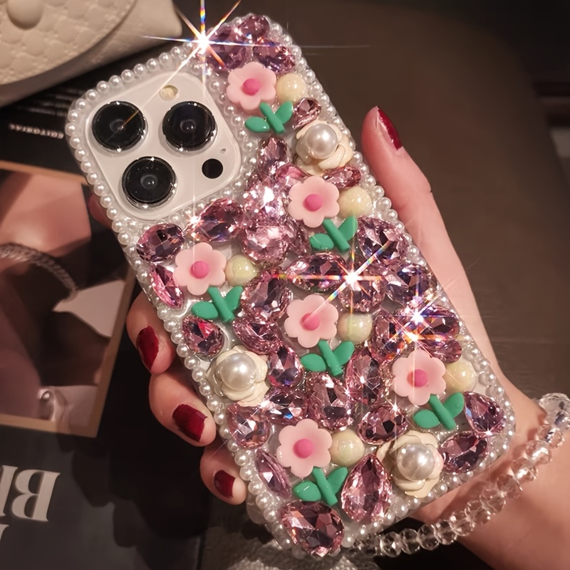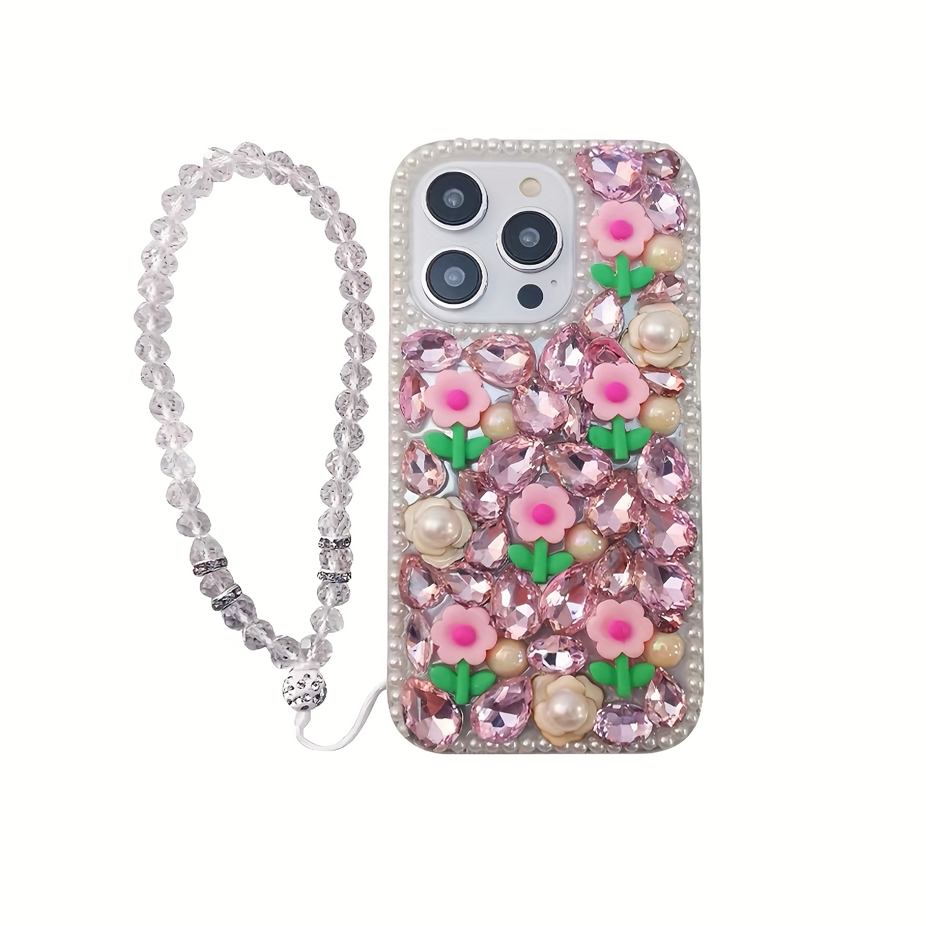 Stylish and Adorable Pearl Edge Pink Small Flower Crystal Phone Case Suitable for iPhone 16 Promax 15 Plus Anti-Drop Phone Case with Gypsum Crystal Bracelet Hanging