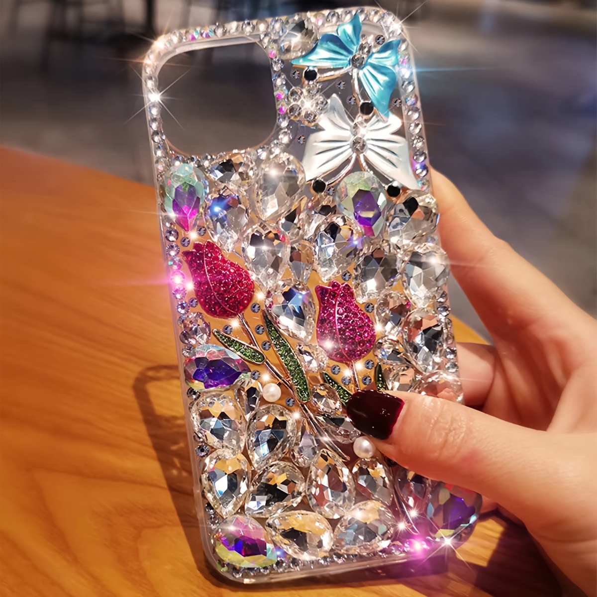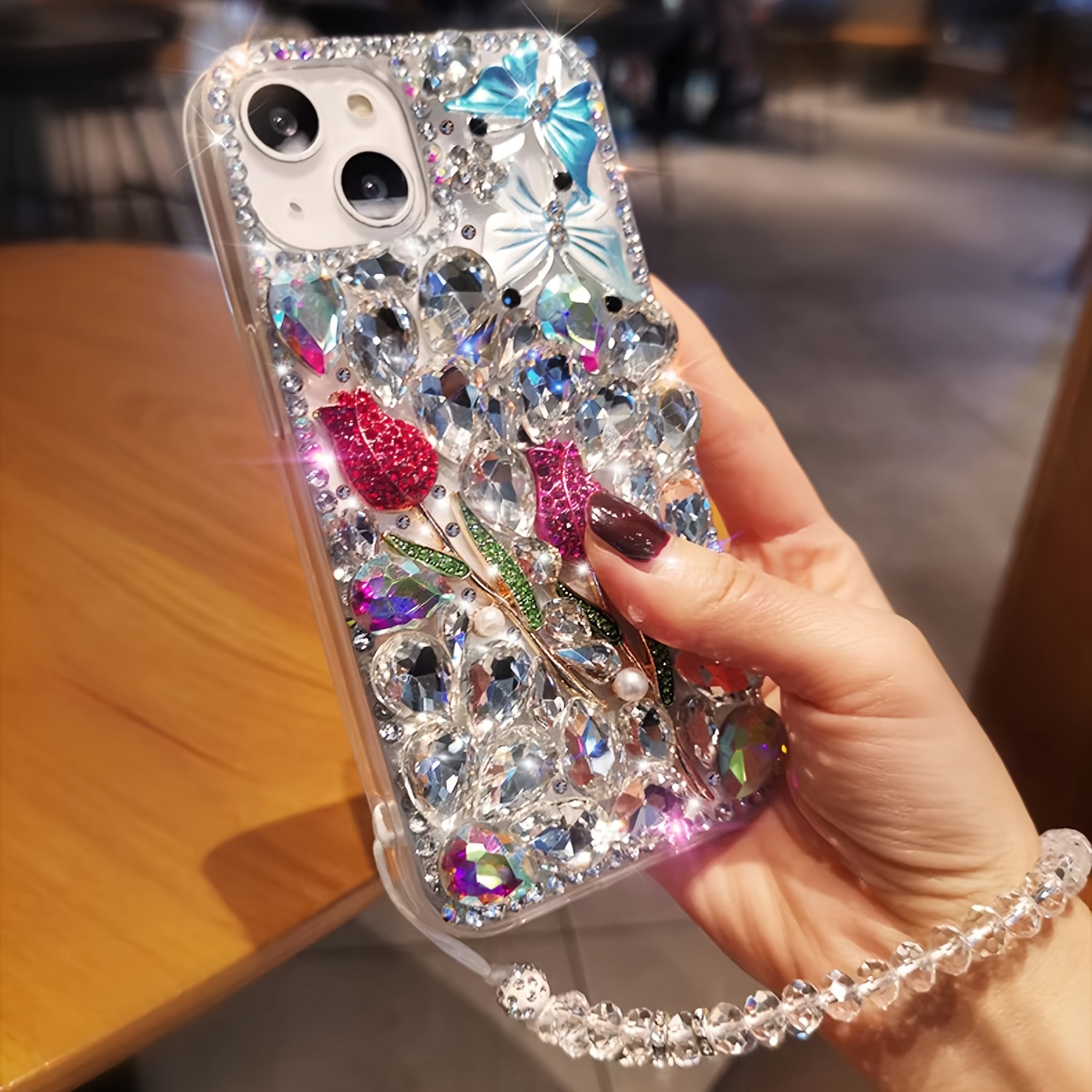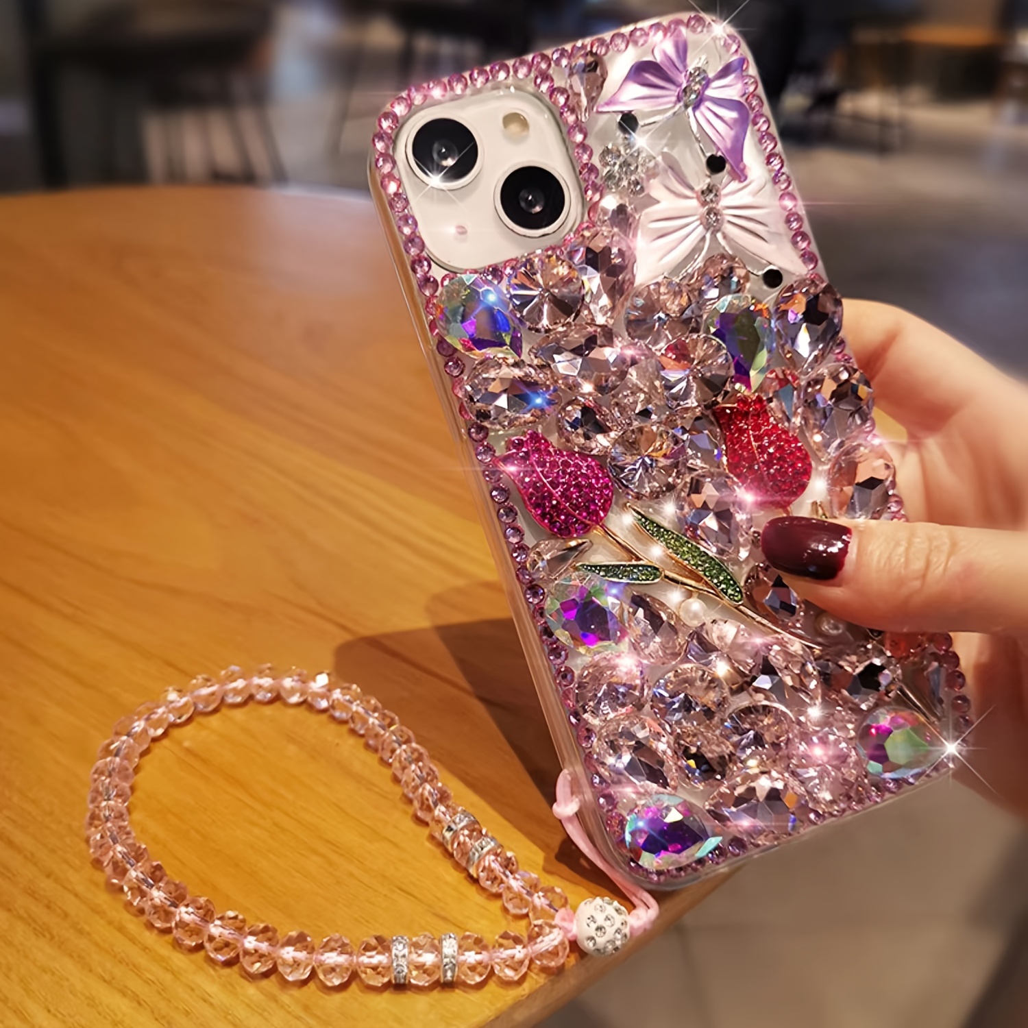 Stylish and Luxurious Double Butterfly Crystal Rose Mobile Phone Protective Case with Crystal Lanyard for iPhone16Promax Anti-Fall Mobile Phone Case