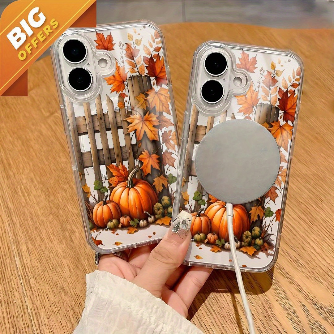 Visual elements of autumn leaves and pumpkins, cultural harvest festival theme, durable TPU technology. Suitable for harvest festival. Offers magnetic compatibility, wireless charging, and a non-yellowing finish. Perfect for iPhone models.